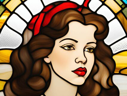 On either side of which fall her glossy curls.