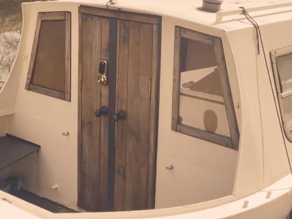 So you open up the wooden door and step down the wooden steps into the boat.