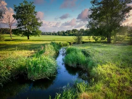 Du befindest dich auf einer saftigen Wiese an einem Bach.