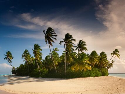 You can see lush green coconut palms gently swaying in the breeze and crystal-clear turquoise waters lapping against a white sand beach.