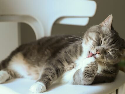 She's too busy licking her paws and trying to get under one of her armpits to give it a scratch and a lick.