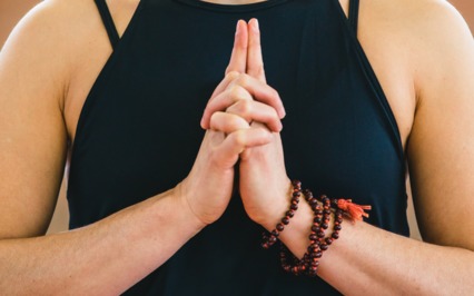 Palms touch overhead.