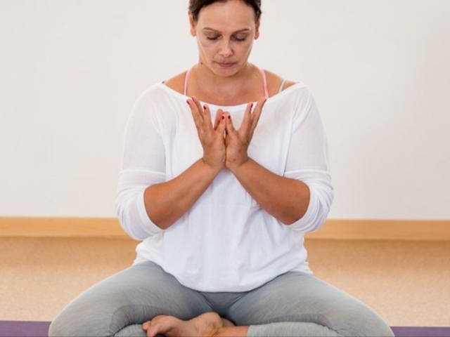 Nimm die Hände vor der Brust zusammen ins Namaste.