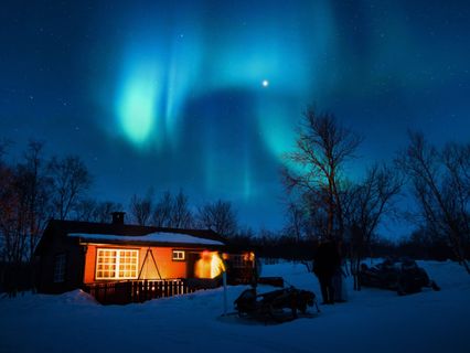 Candlelight flickering in a cabin window.