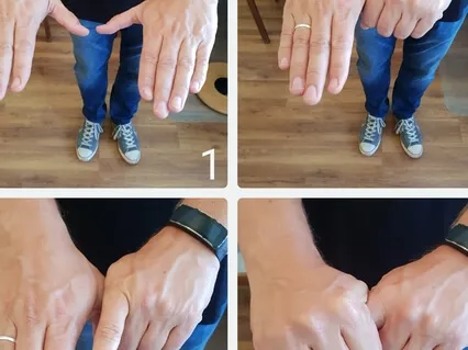 Je laat de duimen van de handen naar mekaar wijzen en dan pak je je rechter duim vast met je linker hand,