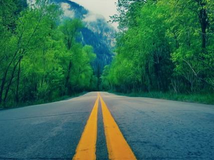 The gentle vibration of the car against the asphalt soothes you as you steer the car around the roads that snake through the trees like gray waves throughout an otherwise lush green forest.