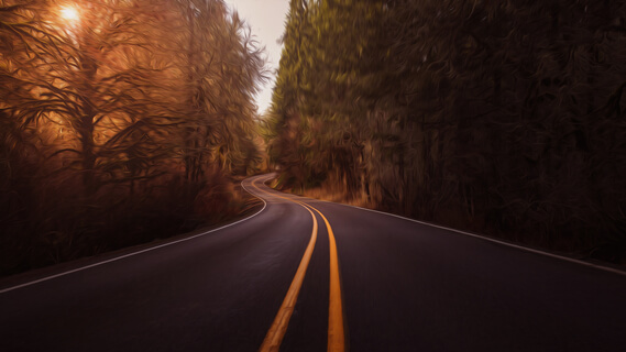 The winding road curves around autumn blaze maple trees with their leaves of vibrant red popping out among trees decked in leaves of topaz and deep amethyst and banana yellow.