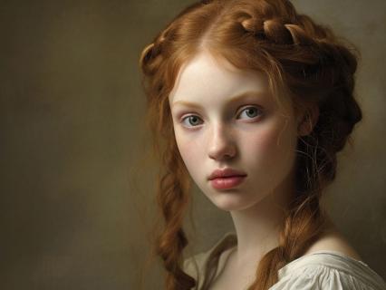 Ugly dress with the long braids of red hair and the eager bright eyes,