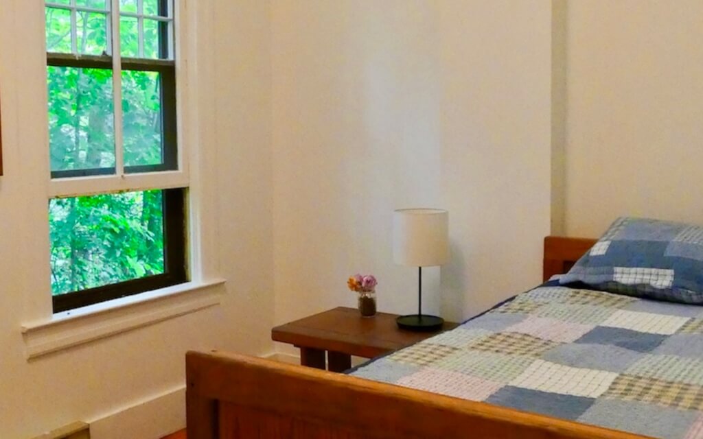 The retreat center offers several housing options, including both private and shared rooms in a large main house surrounded by trees and includes a huge wrap-around porch and rocking chairs, set next to a roaring creek. It also includes shared rooms in modern lodges, with beds that each include a window that opens into the natural surroundings.