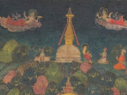 So this painting was made in Nepal and depicts the Swayambhu stupa above the central figure.