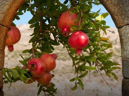 A basket of red pomegranate seeds.