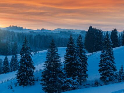 A gentle breeze sweeps curtains of snow from the boughs of evergreen trees,