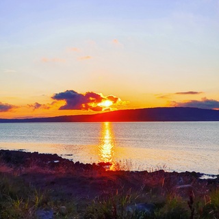 The intense orange sun is setting against the glistening water.