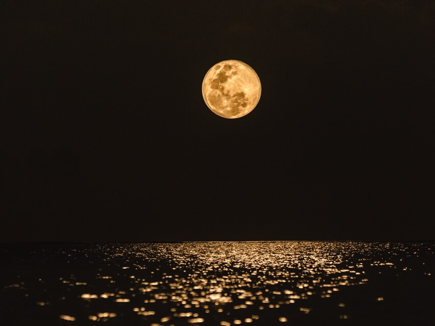 Cette pleine lune se reflète sur les vagues de l'océan et son énergie pénètre dans les eaux profondes.