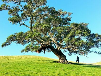 Underneath a blue open sky.
